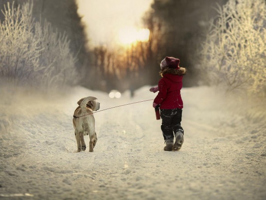 巧妙安排画面,讲述他们的故事;逆光拍摄,让孩子和狗狗多了层光晕